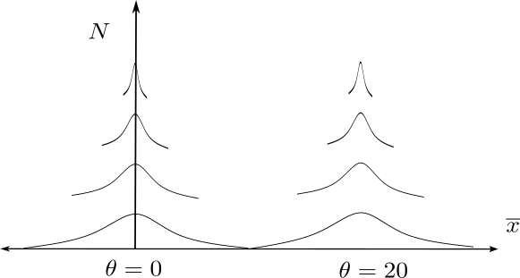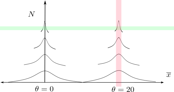 Here, we have \(\overline{x}\) in the horizontal direction, and \(N\) in the vertical direction. Strictly speaking, we have a joint distribution in this space, but I have plotted vertically spaced densities to show how the density of \(\overline{x}\) is centered at the true \(\theta\), but narrows as \(N\) increases.