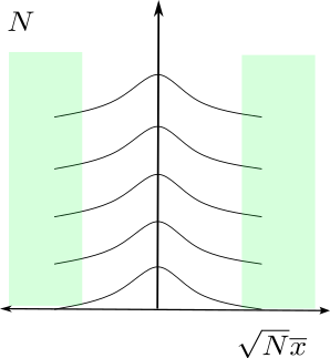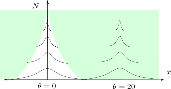 But limiting to observations that are in \(\mathcal{S}\) is not really censoring in the sense that, no matter the value of \(\theta\), the probability of \(\mathcal{S}\) is one. This region is shown in the following figure. A value of \(\theta\) corresponds to a vertical set of densities. It is clear enough that, for any \(\theta \ne 0\), eventually we must get a dataset \(\mathcal{x}_N\) in \(\mathcal{S}\). For \(\theta = 0\), you need to know the law of the iterated logarithm to see that \(\mathcal{S}\) occurs eventually with probability one, but it does.